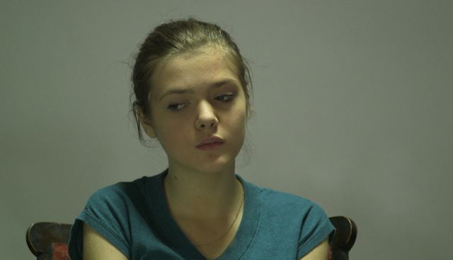 Et au milieu de tout ça, la principale intéressée a disparu. Littéralement absente de l’image, effacée. Dissimulée par sa mère dans le seul axe où elle aurait pu être visible, le spectateur découvre brusquement sa présence, lorsqu’on lui demande enfin son avis. L’apparition subite, par son effet de surprise, fait sourire. D’un sourire jaune. Et cette prise de parole n’est que balbutiement puisque très vite on la lui coupera. Lorsque la jeune fille doit mimer une fellation pour donner un aperçu de la future scène choc du film, elle mime l’excitation de son chiot en se dandinant dans tous les sens, sur les indications et encouragements de sa mère… et sous le regard interloqué des deux hommes. Jamais, il n’est réellement expliqué à la jeune fille les enjeux de la scène, ce qu’elle représente concrètement. Le rire reste coincé dans la gorge, un comique du malaise que Sitaru sait très bien cultiver.