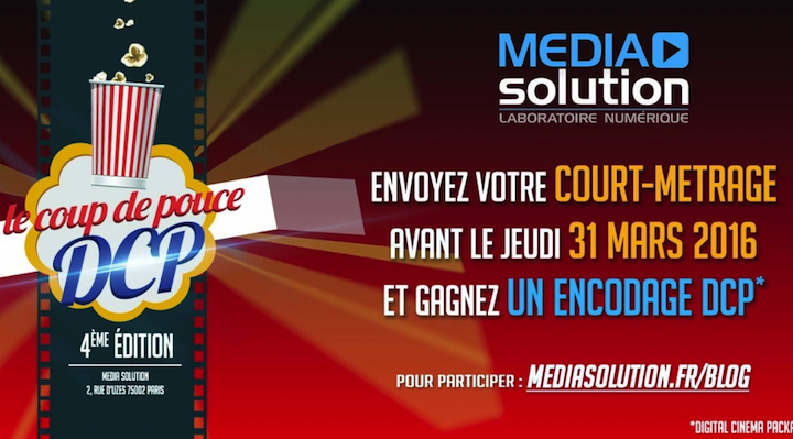 Après le succès remporté par la troisième édition du Coup de Pouce DCP qui avait rassemblé 65 films en compétition, le laboratoire numérique Media Solution, dont nous sommes partenaires pour les Prix Format Court, lance une 4ème édition (la première de l’année 2016) avec un principe simple : offrir un DCP (encodage au format Cinéma Numérique) au lauréat de son nouveau concours afin de permettre sa diffusion en salle, mais aussi et surtout, dans les grands festivals de catégorie 1. Il confirme ainsi sa volonté de soutenir les jeunes talents du court métrage francophone.