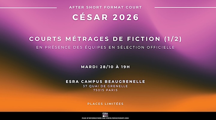 En collaboration avec l’ESRA et le soutien de l’Académie des Arts et Techniques du Cinéma, le magazine Format Court vous invite à la reprise de ses After Short, organisés cette année à l’ESRA Campus Beaugrenelle (Amphithéâtre Jean Renoir, 37 Quai de Grenelle, 75015 Paris).