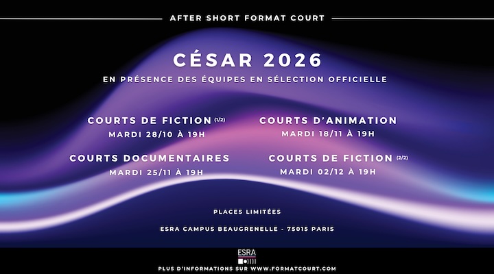 Au vu du nombre important d’équipes de courts de fiction (24) en lice aux prochain César, Format Court consacrera, comme chaque année, 2 soirées au genre. Ce nouveau cycle d’After Short s’ouvrira et se clôturera en effet avec la fiction, les mardi 28 octobre (fiction 1/2) et mardi 2 décembre (fiction 2/2) en présence de nombreux·ses professionnel·les (réalisateur·ices, producteur·ices, membres de comités).