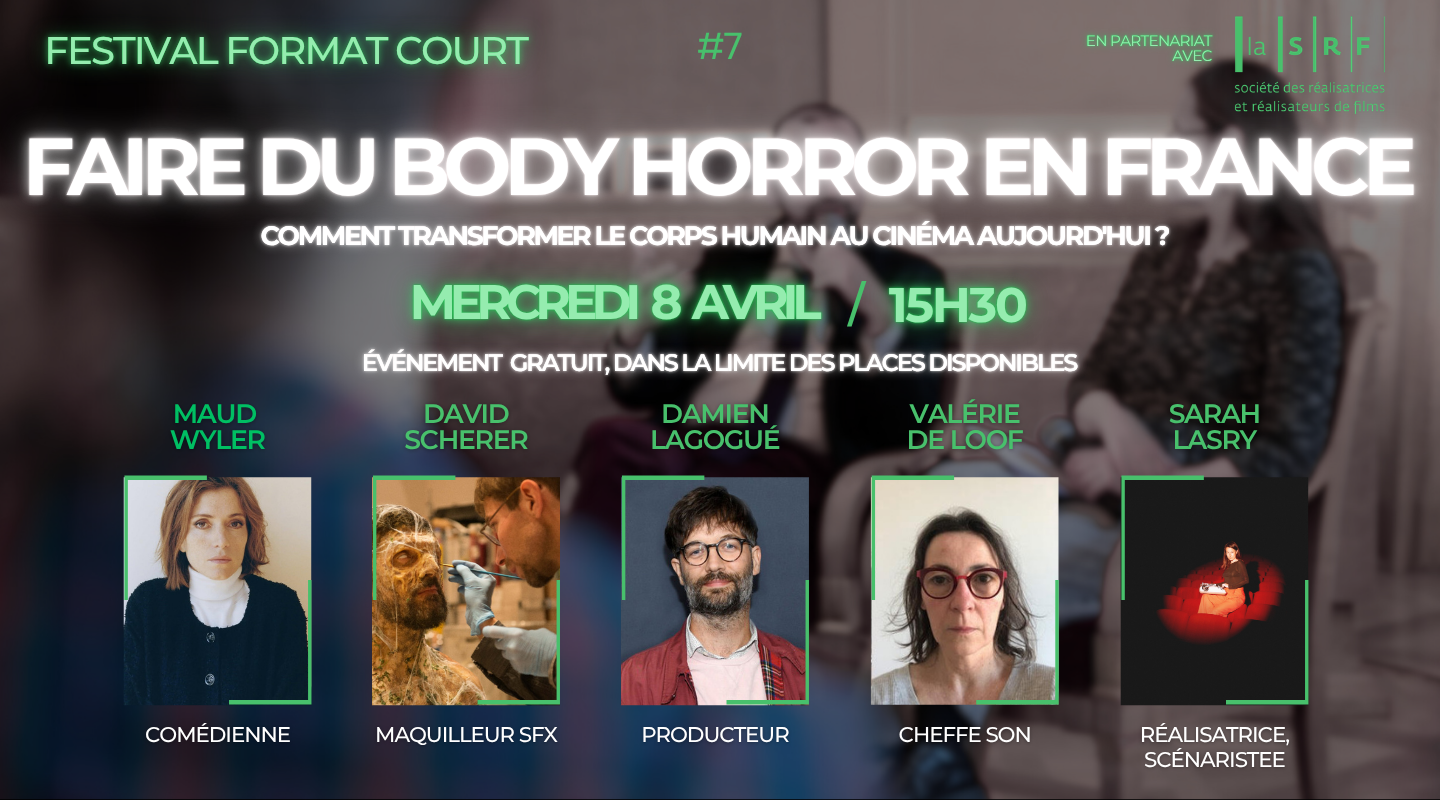Le Festival Format Court accueillera, pour cette table ronde professionnelle menée avec la Société des réalisatrices et réalisateurs de films, cinq intervenants — réalisatrice, producteur, maquilleur FX, actrice et sound designer — qui échangeront sur les enjeux de création et de production du body horror. Retours d’expérience, contraintes techniques, fabrication des effets et conditions de production : la discussion privilégiera une approche concrète, couvrant l’ensemble des étapes de réalisation d’un film.