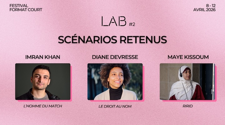 Après le lancement de notre deuxième appel à scénarios (ayant reçu plus de 80 candidatures), le comité de sélection, composé de Nadia Le Bihen-Demmou (CNC), Nathalie Hertzberg (scénariste) et Fanny Barrot (Festival de Clermont-Ferrand), s’est réuni ce lundi 16 mars afin de choisir les 3 lauréats qui intégreront, dès mardi 7 avril le Lab Format Court 2026, pour une semaine de réécriture. À cette occasion, ils seront accompagnés d’Hakim Mao, consultant-scénarise professionnel.