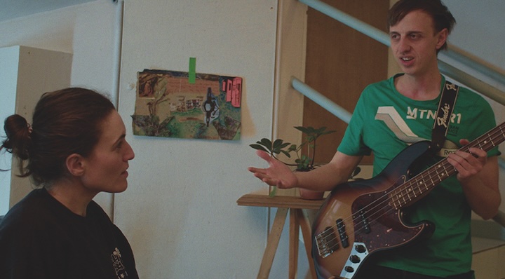 Panem et circenses, c’est ce que demande le peuple. C’est aussi ce que réclame Ferdinand lorsqu’il fait de manière rocambolesque le lit d’une chambre en gardant ses chaussures sur la couette. Dans son joli soliloque, sa logorrhée improvisée, sa tirade enflammée, il façonne une autre réalité trépidante, sa propre arène, où il serait la bête et le gladiateur. Ferdinand parle tout seul, s’évade dans des mises en situation où il se projette : dans l’accueil de clients étrangers venus passer la nuit à la mise en vente d’un tableau d’art en passant par la gestion d’un groupe d’employés. Ferdinand s’invente toutes ces vies parce qu’il a le front moite. C’est les vacances d’été, à Paris, dans l’effervescence des Jeux Olympiques. Le film de Léa Tarral et Judith Longuet-Marx parvient à capter le bouillonnement de la capitale en saisissant un drôle d’hurluberlu, à contre-sens, avec une sorte de flegme qui lui donne un tempo comique remarquable. Un peu comme l’héroïne du film de Valentine Cadic, Le Rendez-vous de l’été, on va le suivre dans une errance burlesque, avec son grand corps dégingandé et ses yeux fatigués, dans le tohu-bohu international dont il est exclu. Tout le monde est dans la liesse de l’événement et passe à côté de l’essentiel : Ferdinand et son sac poubelle qui passe entre les rangées. Il y a un plaisir constant à suivre ce personnage dans tous ses états : Ferdinand à bicyclette, en répétition de musique avec sa basse, en représentation solitaire. Il culmine lorsqu’il accompagne les mélodies au synthé de Juliette par des cris et des mimes.